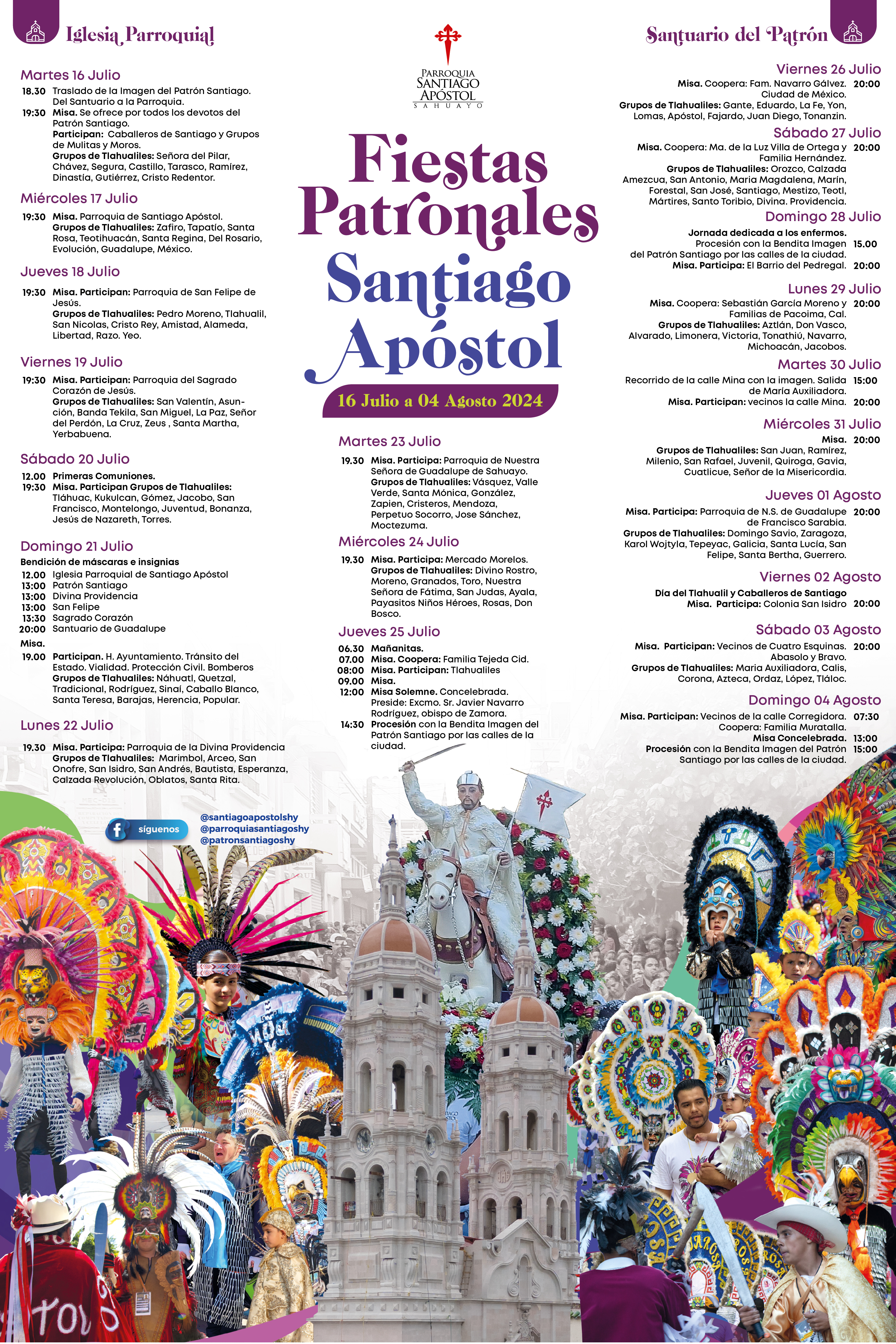 El programa de las fiestas patronales se articula con una secuencia de celebraciones, de procesiones y peregrinaciones en las que destacan las grandes jornadas festivas caracterizadas por el recorrido de la imagen del Patrón Santiago antecedido por Tlahualiles, Moros y Mulitas, trasladado en andas por los Caballeros de Santiago y seguido por un numeroso grupo de feligreses y devotos que rinden veneración cumpliendo con fidelidad los votos o promesas que han hecho a este insigne discípulo de nuestro Señor Jesucristo.
