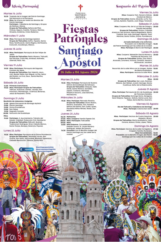 Como ha sido durante años, las fiestas patronales inician el 16 de julio, con el traslado de la venerada imagen a Santiago Apóstol a la Iglesia parroquial, de la que es titular, y concluyen el 4 de agosto, con el último recorrido de la imagen del santo patrono por las calles de la ciudad.