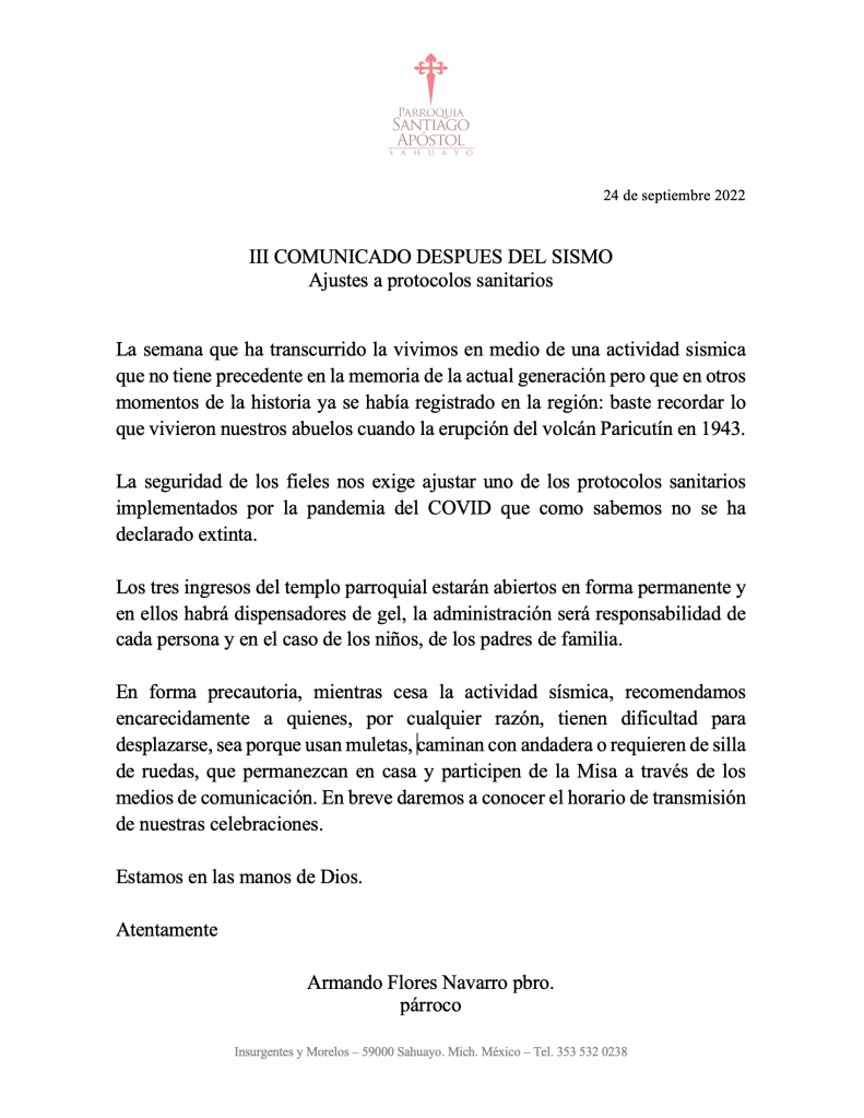 El Señor Obispo Diocesano ha dispuesto que el P. Renato Ávalos Martínez, terminado su período vacacional, concluya su ministerio sacerdotal en nuestra parroquia de Santiago apóstol en Sahuayo para que dedique tiempo completo a distintas actividades de Formación Permanente Sacerdotal.